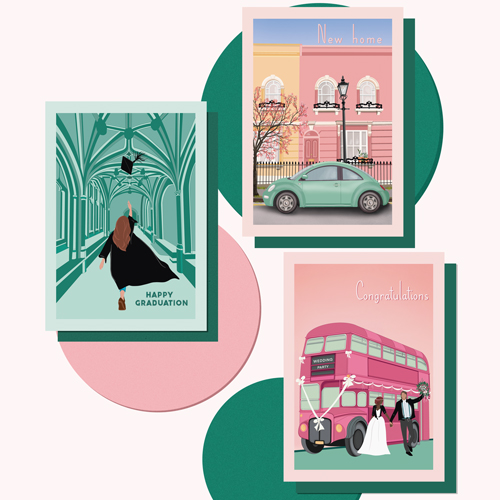 I'm Suzanne, illustrator and creator of Pink and Mint design based in London. I'm here for the Pink and Green addicts! My best selling range is my London location card, postcard and print designs mostly designed entirely in pink and green. I have many occasion based cards, and often feature cats and dogs eating cake.